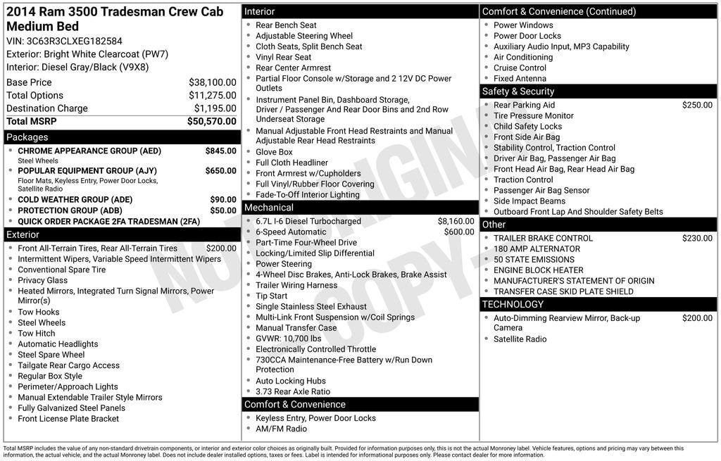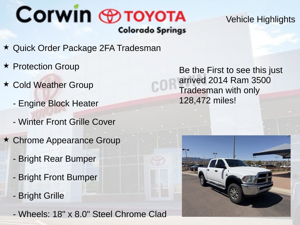 This Ram 3500 is the perfect blend of strength, versatility, and refined comfort. With its impressive performance, advanced technology, and comprehensive suite of features, it's the ultimate tool for work and play. Don't miss your chance to make this exceptional truck your own. Visit our showroom today and let us demonstrate why the 2014 Ram 3500 Tradesman is the perfect choice for your next vehicle.