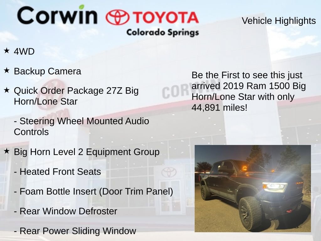 This Ram 1500 is well equipped and includes the following features and benefits, 4WD, Backup Camera, 115V Auxiliary Power Outlet, 115V Auxiliary Rear Power Outlet, 2 USB Full Function/Charge Only Media Hub, 400W Inverter, 8.4" Touchscreen Display, Add Class IV Receiver Hitch, Air Conditioning ATC w/Dual Zone Control, Auto-Dimming Exterior Driver Mirror, Auto-Dimming Rear-View Mirror, Big Horn IP Badge, Big Horn Level 2 Equipment Group, Black Interior Accents, Body Color Door Handles, Body Color Front Bumper, Body Color Rear Bumper w/Step Pads, Class IV Receiver Hitch, Cluster 7.0" TFT Color Display, Dampened Tailgate, Deluxe Cloth Bucket Seats, Exterior Mirrors Courtesy Lamps, Exterior Mirrors w/Memory, Exterior Mirrors w/Supplemental Signals, Foam Bottle Insert (Door Trim Panel), Front LED Fog Lamps, Glove Box Lamp, Grille B/Color Outline 1 Texture 2, Heated Front Seats, Heated Steering Wheel, Integrated Center Stack Radio, LED Reflector Headlamps, LED Taillamps, ParkSense Front/Rear Park Assist w/Stop, Power 4-Way Driver Lumbar Adjust, Power 8-Way Driver Seat, Power Adjustable Pedals, Power Black Trailer Tow Mirrors, Power Heated Fold Away Mirrors, Power Heated Fold-Away Mirrors, Power-Folding Mirrors, Premium Lighting Group, Protection Group, Quick Order Package 27Z Big Horn/Lone Star, Radio: Uconnect 4 w/8.4" Display, Rear Dome w/On/Off Switch Lamp, Rear Power Sliding Window, Rear Window Defroster, Remote Start System, Security Alarm, Single Disc Remote CD Player, SiriusXM Satellite Radio, Sport Appearance Package, Steering Wheel Mounted Audio Controls, Sun Visors w/Illuminated Vanity Mirrors, Tow Hooks, Trailer Brake Control, Trailer Tow Group, Trailer Tow Mirrors, Universal Garage Door Opener.