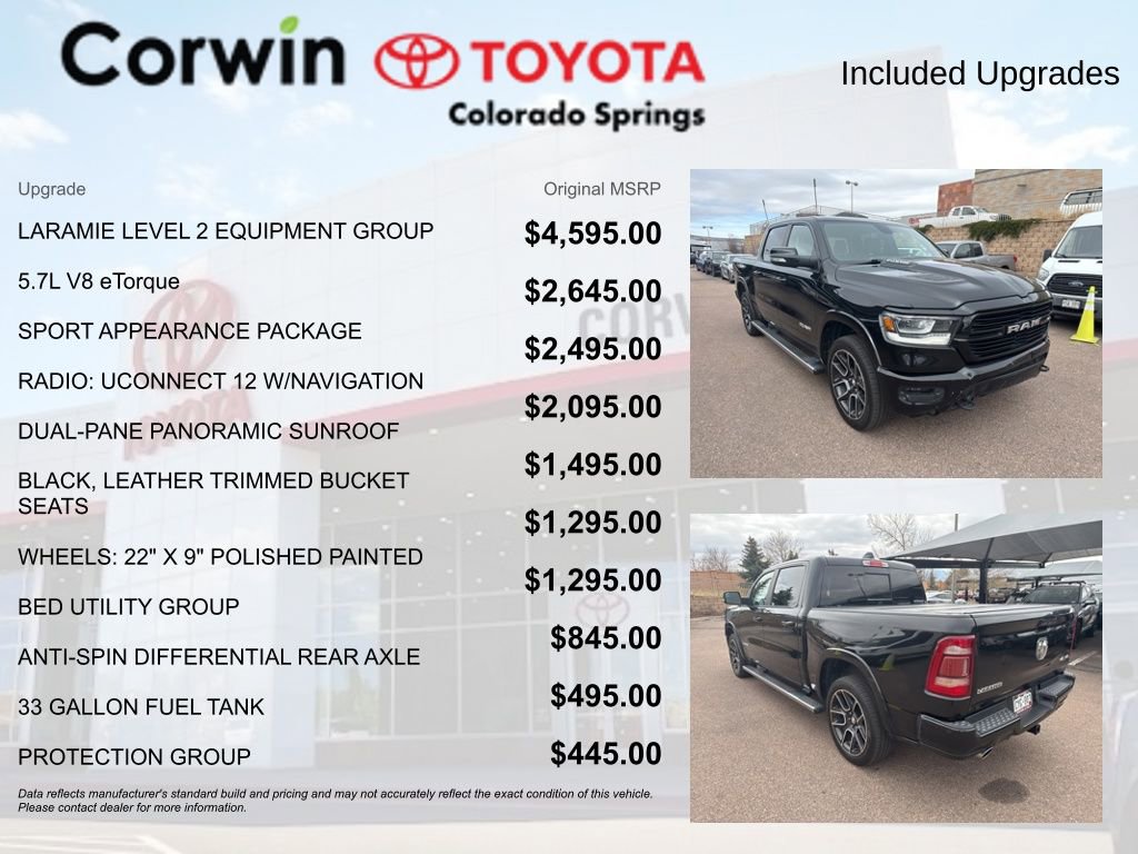 - Laramie Level 2 Equipment Group (Blind Spot & Cross Path Detection, Rain Sensitive Windshield Wipers, ParkSense Front/Rear Park Assist, Wireless Charging Pad, Uconnect 4C Nav w/8.4" Display, harman/kardon 19 Speaker Premium Sound, and more)