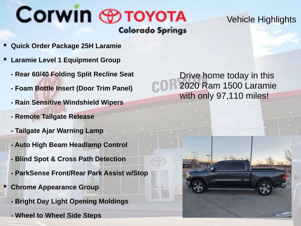 Elevate your driving experience with this 2020 Ram 1500 Laramie. Boasting a powerful HEMI 5.7L V8 engine, this capable 4WD truck delivers exceptional performance and efficiency, with an impressive 15 city/21 highway MPG rating.