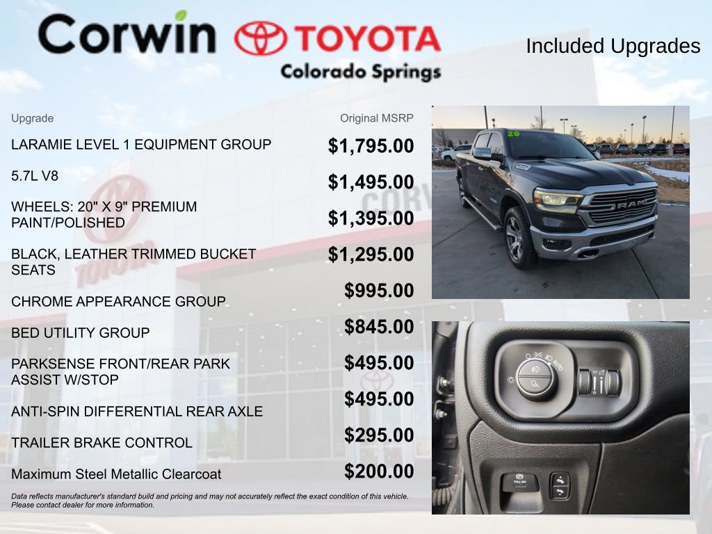 Whether hauling heavy loads, towing your toys, or simply enjoying a comfortable daily commute, this 2020 Ram 1500 Laramie is ready to exceed your expectations. Experience the perfect blend of power, capability, and refinement. Schedule a test drive today and discover why the Ram 1500 is the ultimate full-size pickup.