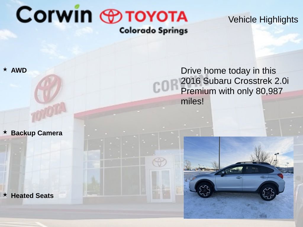 This Subaru Crosstrek is well equipped and includes the following features and benefits, AWD, Backup Camera, Heated Seats. Odometer is 28543 miles below market average! 26/34 City/Highway MPG