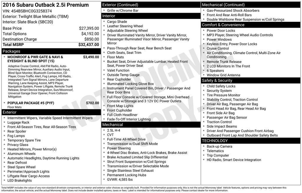 2016 Twilight Blue Metallic Subaru Outback 2.5i Premium