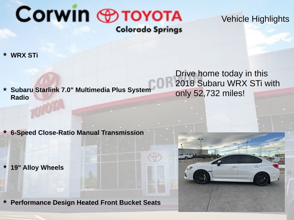 Discover the exhilarating performance and exceptional features of this 2018 Subaru WRX STi. Meticulously maintained and ready to thrill, this iconic sports car is a true driver's delight.