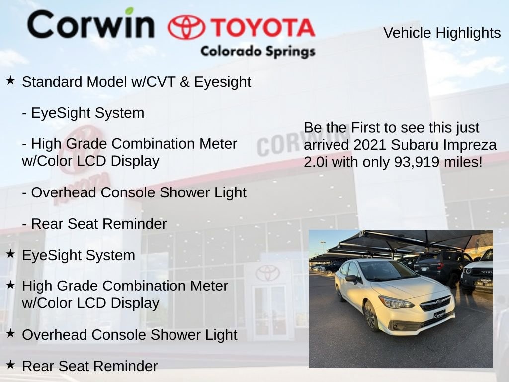 This Subaru Impreza is well equipped and includes the following features and benefits, EyeSight System, High Grade Combination Meter w/Color LCD Display, Overhead Console Shower Light, Rear Seat Reminder, Standard Model w/CVT & Eyesight. 28/36 City/Highway MPG