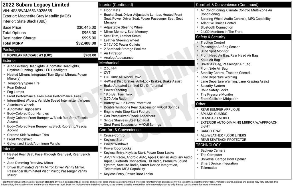 This Subaru Legacy is well equipped and includes the following features and benefits, AWD, Backup Camera, Heated Seats, All-Weather Floor Liners, Cargo Tray, Exterior Auto-Dimming Mirror w/Approach Light, Popular Package #3, Rear Bumper Applique, Rear Seatback Protector, Splash Guards. Odometer is 20163 miles below market average! 27/35 City/Highway MPG
