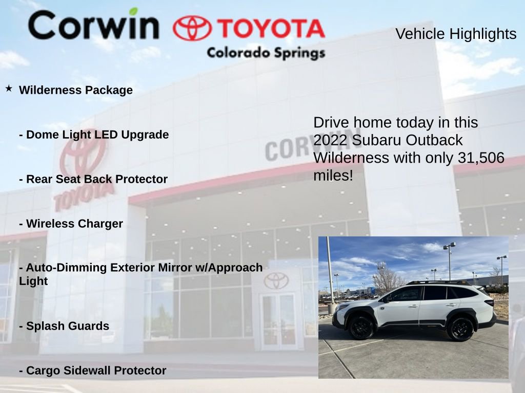This Subaru Outback is well equipped and includes the following features and benefits, Auto-Dimming Exterior Mirror w/Approach Light, Cargo Sidewall Protector, Dome Light LED Upgrade, Rear Seat Back Protector, Splash Guards, Wilderness Package, Wireless Charger. Odometer is 21197 miles below market average! 22/26 City/Highway MPG