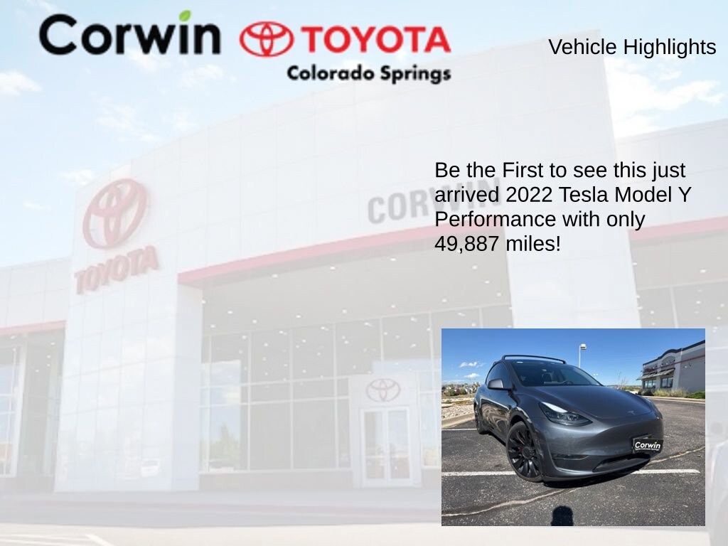 This Tesla Model Y is well equipped and includes the following features and benefits, Tire Specific Low Tire Pressure Warning Side Impact Beams Restricted Driving Mode/Alerts Rear Collision Warning Dual Stage Driver And Passenger Seat-Mounted Side Airbags Front And Rear Parking Sensors Blind Spot Forward Collision Mitigation and Rear Collision Warning Aerial View Camera System Collision Mitigation-Front Driver Monitoring-Alert Right Side Camera Dual Stage Driver And Passenger Front Airbags Curtain 1st And 2nd Row Airbags Airbag Occupancy Sensor Driver And Passenger Knee Airbag Restricted Driving Mode Power Rear Child Safety Locks Outboard Front Lap And Shoulder Safety Belts -inc: Rear Center 3 Point, Height Adjusters and Pretensioners Back-Up Camera Front Camera Left Side Camera, Black Fender Flares Black Grille Black Side Windows Trim Black Door Handles Body-Colored Power w/Tilt Down Heated Auto Dimming Side Mirrors w/Power Folding Fixed Rear Window w/Defroster Light Tinted Glass Variable Intermittent Wipers Galvanized Steel/Aluminum Panels Lip Spoiler Auto On/Off Aero-Composite Led Low/High Beam Daytime Running Auto-Leveling Auto High-Beam Headlamps w/Delay-Off Front Fog Lamps Perimeter/Approach Lights LED Brakelights Headlights-Automatic Highbeams Laminated Glass Variable Intermittent Wipers w/Heated Wiper Park Body-Colored Front Bumper Fixed Laminated Glass 1st And 2nd Row Sunroof Clearcoat Paint Tires: 255/35R21 Front & 275/35R21 Rear Wheels: 21" x 9.5 Fr & 21" x 10.5 Rr Uberturbine Body-Colored Rear Bumper Deep Tinted Glass Rain Detecting Variable Intermittent Wipers w/Heated Wiper Park Auto On/Off Reflector Led Low/High Beam Daytime Running Auto-Leveling Auto High-Beam Headlamps w/Delay-Off Pearlcoat Paint, Delayed Accessory Power Front Center Armrest and Rear Center Armrest Systems Monitor Outside Temp Gauge Digital Appearance Fixed Front Head Restraints and Fixed Rear Head Restraints Fade-To-Off Interior Lighting Instrument Panel Covered Bin, Driver / Passenger And Rear Door Bins Smart Device Integration Tracker System Cargo Space Lights Cargo Area Concealed Storage Carpet Floor Trim Full Carpet Floor Covering -inc: Carpet Front And Rear Floor Mats 2 Seatback Storage Pockets Engine Immobilizer 1 12V DC Power Outlet Air Filtration Voice Activated Dual Zone Front Automatic Air Conditioning w/Steering Wheel Controls Full Service Internet Access 2 12V DC Power Outlets Folding Cargo Cover Full Floor Console w/Covered Storage and 2 12V DC Power Outlets Driver Information Center Fixed Front Head Restraints and Manual Adjustable Rear Head Restraints. 115/106 City/Highway MPG