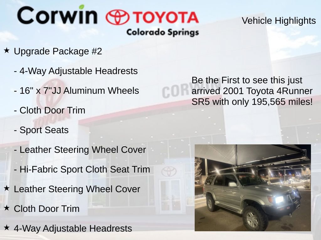 This Toyota 4Runner is well equipped and includes the following features and benefits, 16" x 7"JJ Aluminum Wheels, 4-Way Adjustable Headrests, Cloth Door Trim, Hi-Fabric Sport Cloth Seat Trim, Leather Steering Wheel Cover, Sport Seats, Upgrade Package #2.