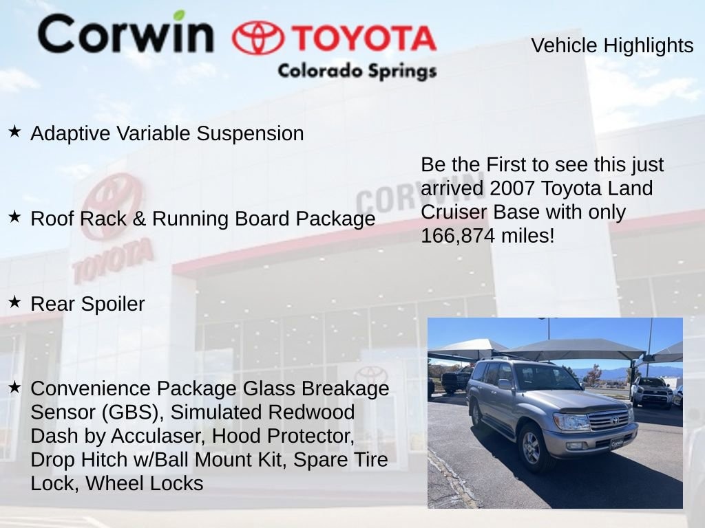 This Toyota Land Cruiser is well equipped and includes the following features and benefits, Adaptive Variable Suspension, Roof Rack & Running Board Package, Rear Spoiler, Convenience Package Glass Breakage Sensor (GBS), Simulated Redwood Dash by Acculaser, Hood Protector, Drop Hitch w/Ball Mount Kit, Spare Tire Lock, Wheel Locks. Odometer is 16226 miles below market average!