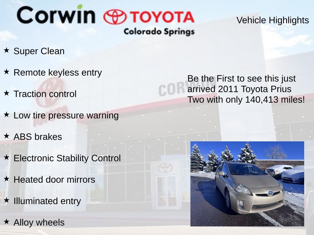 This Toyota Prius is well equipped and includes the following features and benefits, Super Clean, ABS brakes, Alloy wheels, Electronic Stability Control, Heated door mirrors, Illuminated entry, Low tire pressure warning, Remote keyless entry, Traction control. 51/48 City/Highway MPG