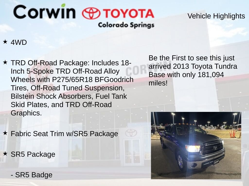 This Toyota Tundra is well equipped and includes the following features and benefits, 4WD, TRD Off-Road Package: Includes 18-Inch 5-Spoke TRD Off-Road Alloy Wheels with P275/65R18 BFGoodrich Tires, Off-Road Tuned Suspension, Bilstein Shock Absorbers, Fuel Tank Skid Plates, and TRD Off-Road Graphics., 170-Amp Alternator, 4.30 Rear Differential, Clear Front Fog & Driving Lights, Fabric Seat Trim w/SR5 Package, Power Bucket Seats, SR5 Badge, SR5 Package, Supplemental Transmission Cooler, Tow Package.