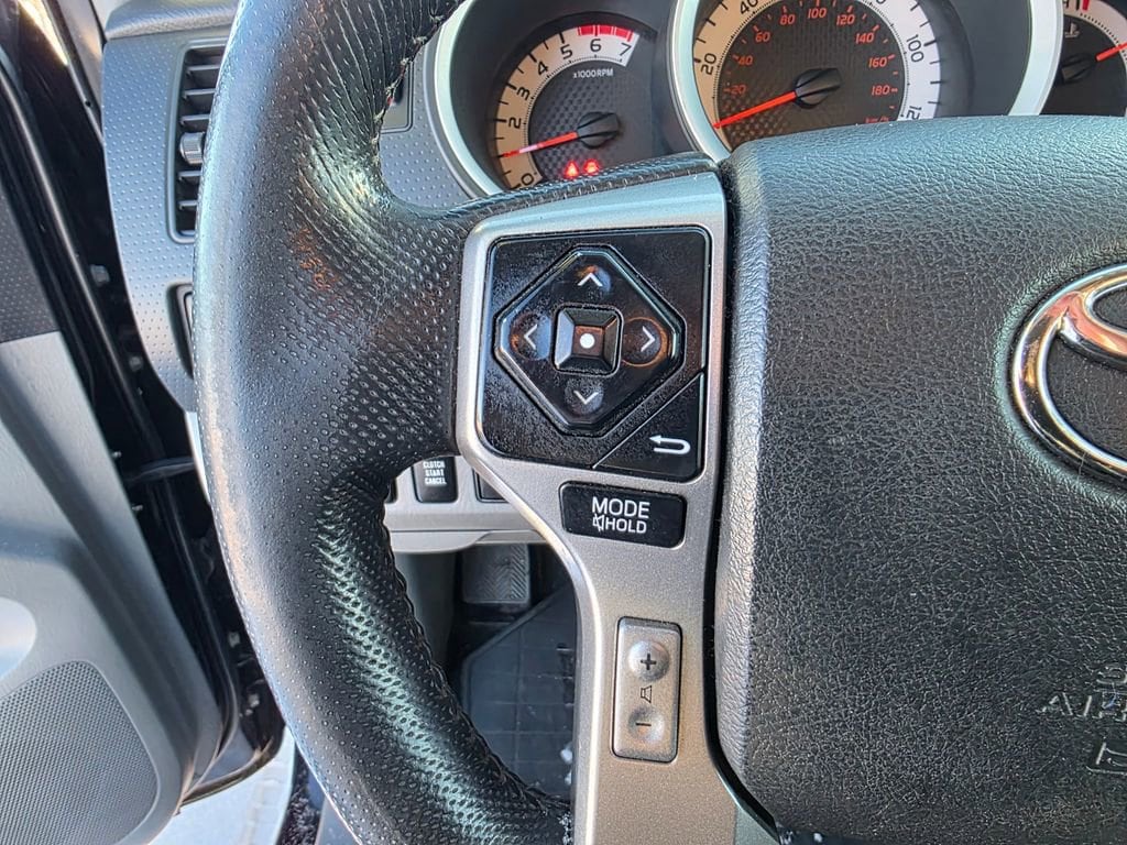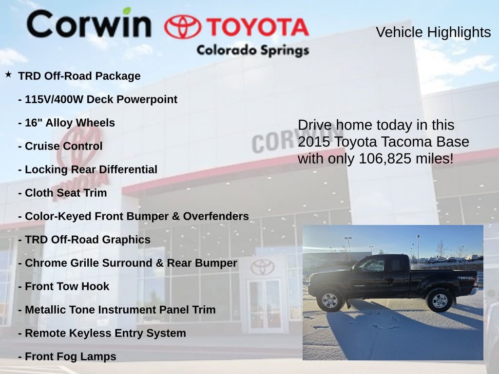 This Toyota Tacoma is well equipped and includes the following features and benefits, 115V/400W Deck Powerpoint, 16" Alloy Wheels, Active Traction Control (A-TRAC), Bilstein Shocks, Chrome Grille Surround & Rear Bumper, Cloth Seat Trim, Color-Keyed Front Bumper & Overfenders, Cruise Control, Dual Sunvisors w/Mirrors & Extenders, Front Fog Lamps, Front Tow Hook, Locking Rear Differential, Metallic Tone Instrument Panel Trim, Off Road Tuned Suspension, Power Outside Mirrors, Remote Keyless Entry System, Sliding Rear Window, Sport Seats, Tailgate-Handle Integrated Backup Camera, TRD Off-Road Graphics, TRD Off-Road Package, Variable Speed Wipers.