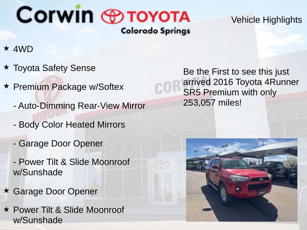 Discover the ultimate adventure companion in this 2016 Toyota 4Runner SR5 Premium. With its robust 4.0L V6 engine, 4-wheel drive capability, and impressive towing capacity, this SUV is ready to take you and your gear wherever the road, or trail, may lead.