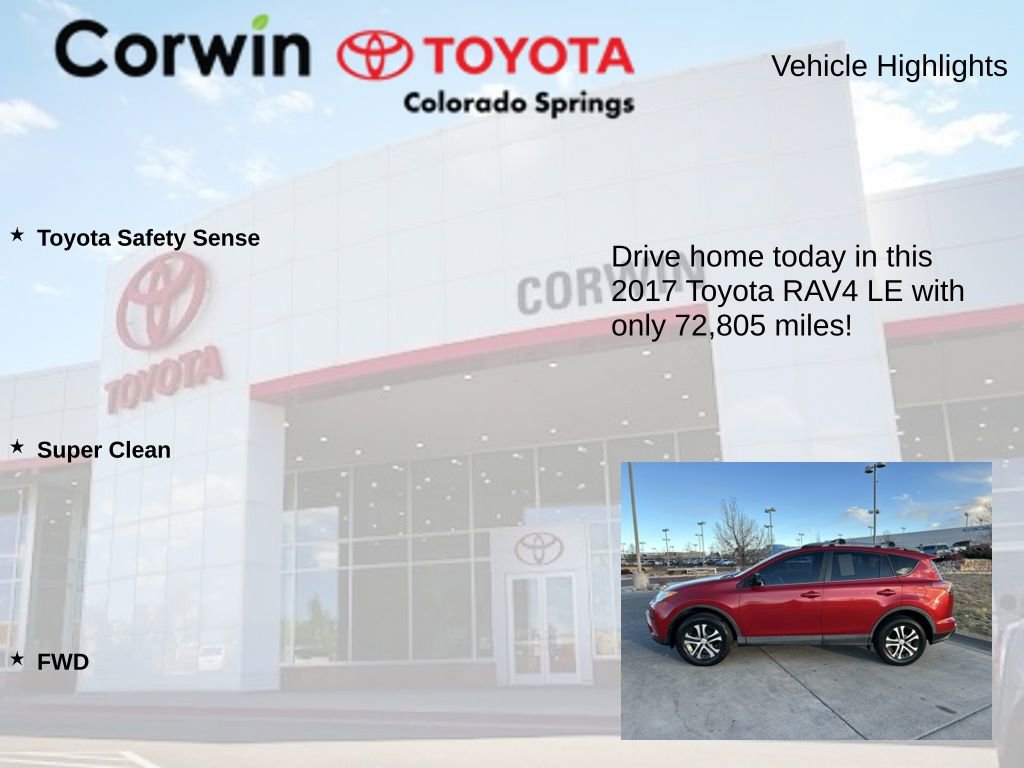 This Toyota RAV4 is well equipped and includes the following features and benefits, Toyota Safety Sense, Super Clean, FWD. Odometer is 17486 miles below market average! 23/30 City/Highway MPG