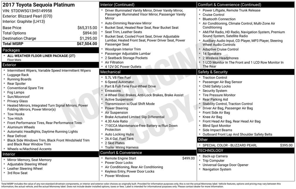 Boasting a commanding presence on the road, the Sequoia Platinum is equipped with a robust i-Force 5.7L V8 DOHC VVT-i Flex Fuel engine, delivering a thrilling 6-speed automatic transmission and impressive 4WD capabilities. Enjoy the convenience of remote engine start, while the special Blizzard Pearl exterior color adds a touch of elegance to this already impressive vehicle.