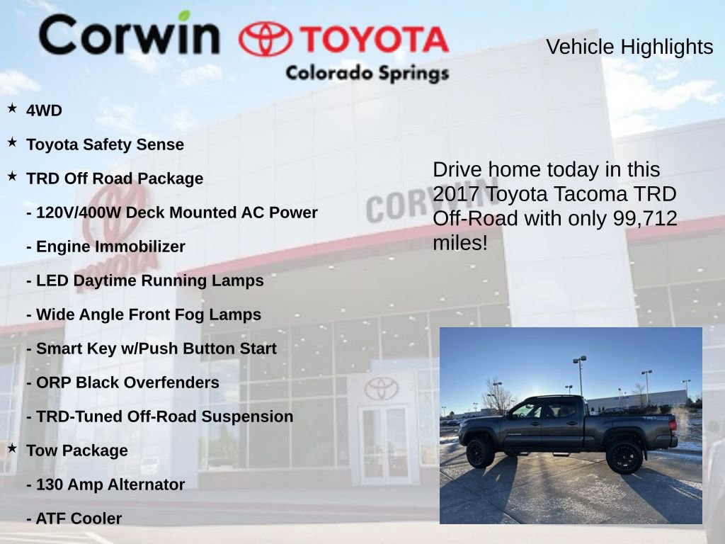 Whether you're tackling rugged trails or navigating the daily commute, this 2017 Toyota Tacoma TRD Off-Road is the ultimate choice for those seeking a capable, well-equipped, and versatile truck. Experience the difference for yourself by scheduling a test drive today.