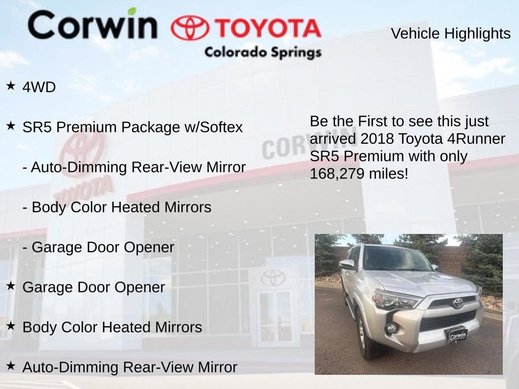 Discover the true spirit of adventure in the 2018 Toyota 4Runner SR5 Premium. With its rugged good looks, impressive performance, and exceptional feature set, this SUV is ready to elevate your driving experience to new heights. Visit our showroom today and let us demonstrate how this 4Runner can transform the way you explore the world around you.