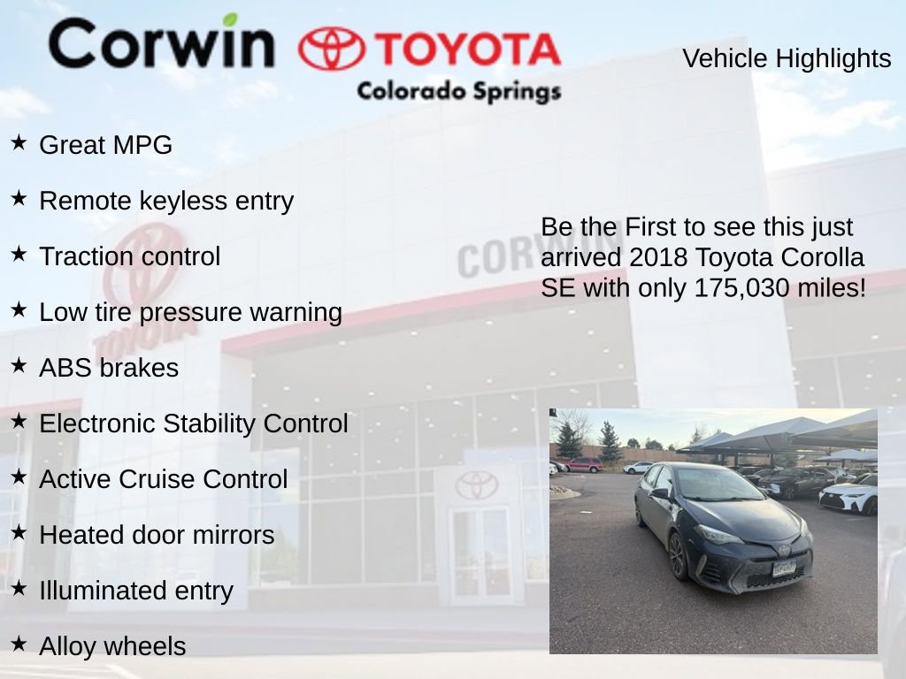 This Toyota Corolla is well equipped and includes the following features and benefits, Great MPG, ABS brakes, Active Cruise Control, Alloy wheels, Electronic Stability Control, Heated door mirrors, Illuminated entry, Low tire pressure warning, Remote keyless entry, Traction control. 28/36 City/Highway MPG