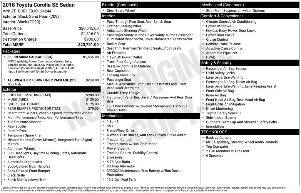 Discover the impressive 2018 Toyota Corolla SE, a compact sedan that delivers exceptional value and a rewarding driving experience. With its sleek black exterior and well-equipped interior, this Corolla SE offers the perfect blend of style, technology, and practicality.