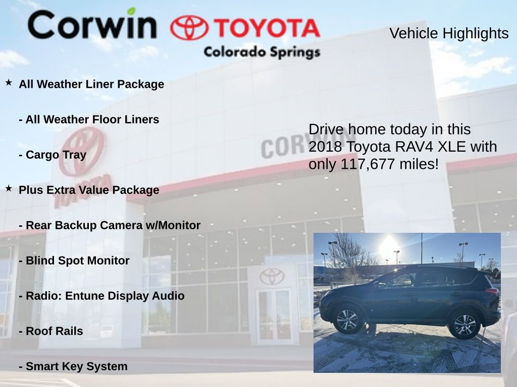 This Toyota RAV4 is well equipped and includes the following features and benefits, All Weather Floor Liners, All Weather Liner Package, Blind Spot Monitor, Cargo Tray, Plus Extra Value Package, Radio: Entune Display Audio, Rear Backup Camera w/Monitor, Roof Rails, Smart Key System. 22/28 City/Highway MPG
