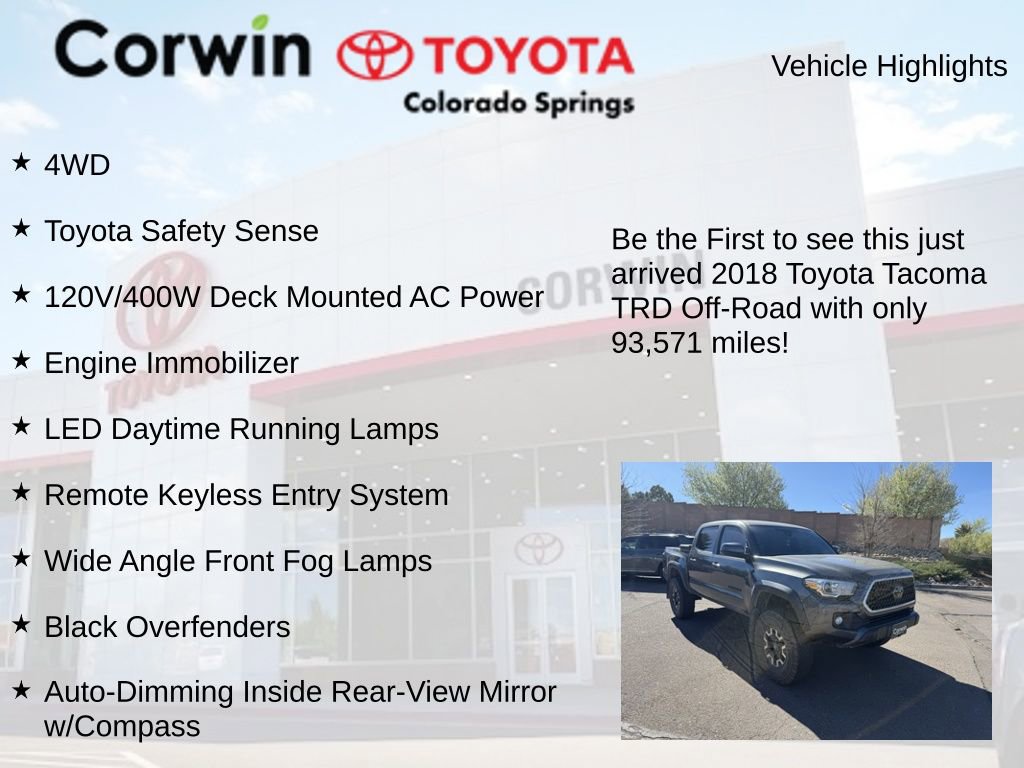 Discover the ultimate off-road companion in this 2018 Toyota Tacoma TRD Off-Road V6. Boasting a powerful 3.5L V6 engine and impressive 4WD capabilities, this rugged truck is ready to take on any adventure. Equipped with the advanced Toyota Safety Sense suite, you can conquer the trails with confidence, knowing your safety is a top priority.