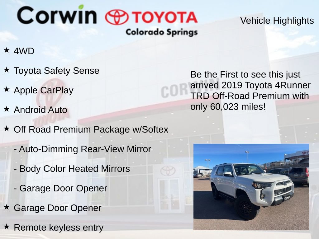 This Toyota 4Runner is well equipped and includes the following features and benefits, 4WD, Toyota Safety Sense, Apple CarPlay, Android Auto, ABS brakes, Alloy wheels, Auto-Dimming Rear-View Mirror, Body Color Heated Mirrors, Compass, Electronic Stability Control, Garage Door Opener, Heated door mirrors, Heated Front Bucket Seats, Heated front seats, Illuminated entry, Low tire pressure warning, Off Road Premium Package w/Softex, Remote keyless entry, Traction control. Odometer is 18294 miles below market average!