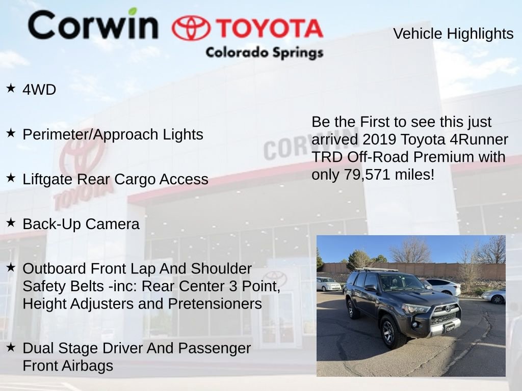 This Toyota 4Runner is well equipped and includes the following features and benefits, 4WD, Perimeter/Approach Lights, Liftgate Rear Cargo Access, Back-Up Camera, Outboard Front Lap And Shoulder Safety Belts -inc: Rear Center 3 Point, Height Adjusters and Pretensioners, Dual Stage Driver And Passenger Front Airbags, Liftgate Rear Cargo Access.