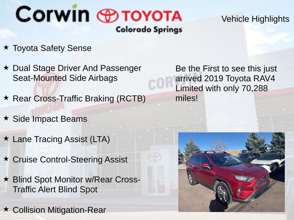 This Toyota RAV4 is well equipped and includes the following features and benefits, Toyota Safety Sense, Dual Stage Driver And Passenger Seat-Mounted Side Airbags, Rear Cross-Traffic Braking (RCTB), Side Impact Beams, Lane Tracing Assist (LTA), Cruise Control-Steering Assist, Blind Spot Monitor w/Rear Cross-Traffic Alert Blind Spot, Collision Mitigation-Rear. 26/35 City/Highway MPG