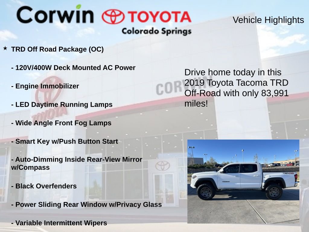 Discover the ultimate off-road companion in this 2019 Toyota Tacoma TRD Off-Road V6. With its powerful 3.5L V6 engine, 6-speed automatic transmission, and capable 4WD system, this Tacoma is ready to tackle any terrain you throw its way. Whether you're navigating rugged trails or conquering the daily commute, this truck's impressive performance and impressive fuel efficiency of 18 city/22 highway MPG will keep you moving with confidence.