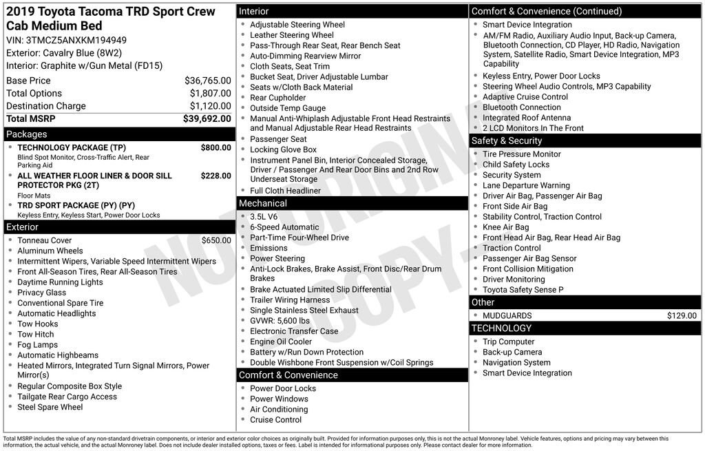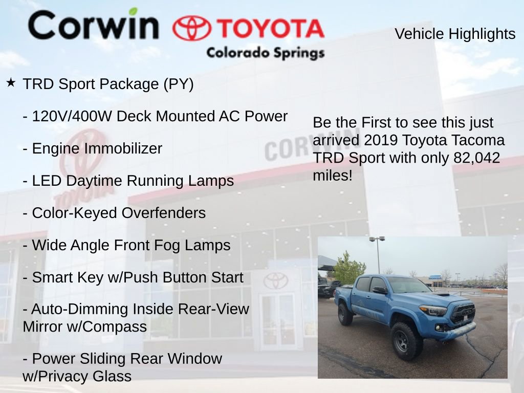 With its exceptional capability, advanced technology, and distinctive style, this 2019 Toyota Tacoma TRD Sport V6 is the ultimate choice for those who demand more from their truck. Experience the difference for yourself and schedule a test drive today. We're confident you'll be impressed by this exceptional vehicle.