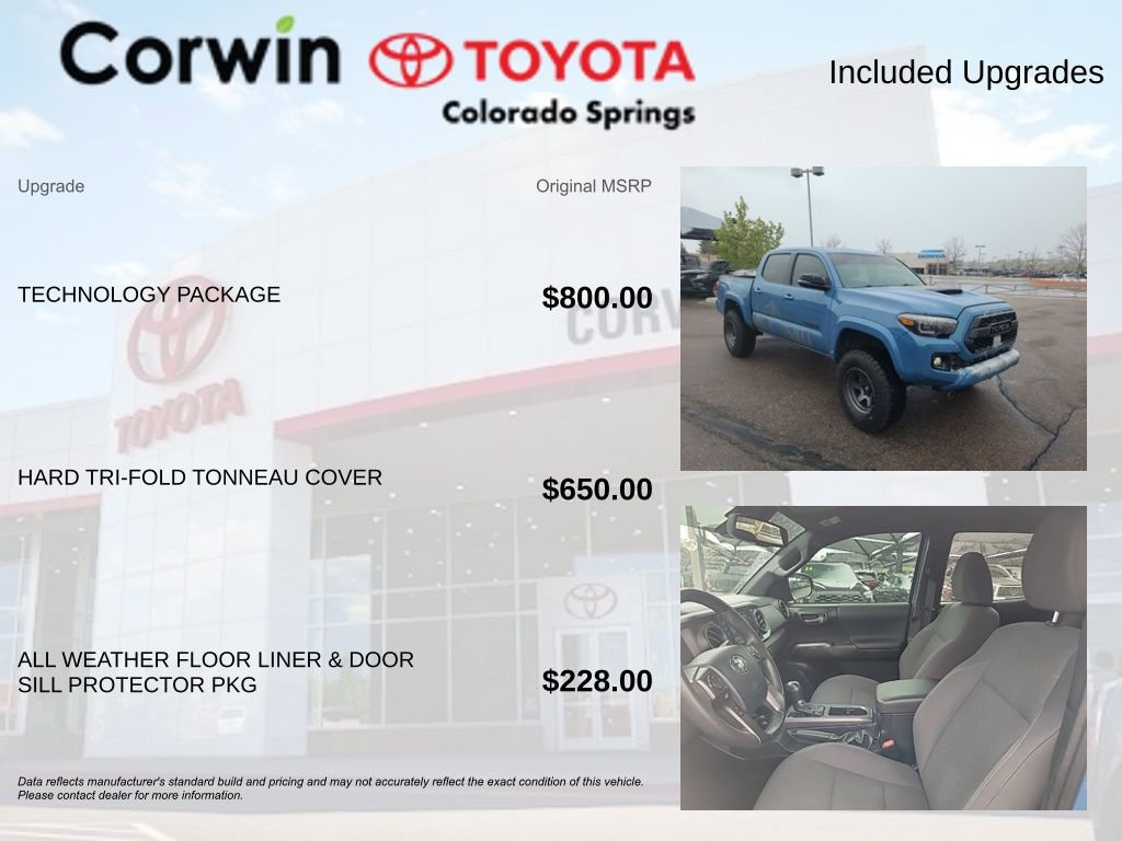 This Tacoma is packed with premium features that elevate your driving experience. The Technology Package adds advanced safety and convenience features, while the TRD Sport Package enhances the Tacoma's bold, sporty styling. Enjoy the convenience of the 120V/400W power outlet, the visibility of the LED daytime running lamps, and the added protection of the all-weather floor liners and tonneau cover.
