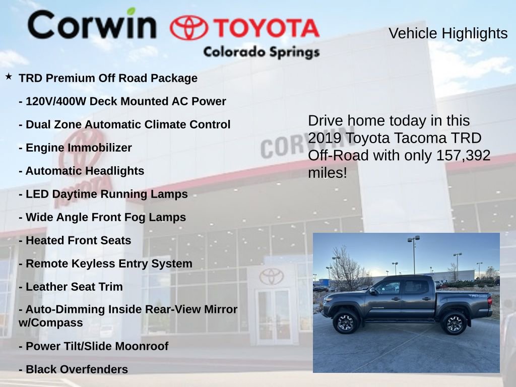 This Toyota Tacoma is well equipped and includes the following features and benefits, ABS brakes, Alloy wheels, Automatic Headlights, Dual Zone Automatic Climate Control, Electronic Stability Control, Heated Front Seats, Illuminated entry, Leather Seat Trim, Low tire pressure warning, Power Tilt/Slide Moonroof, Remote keyless entry, Traction control, TRD Premium Off Road Package.