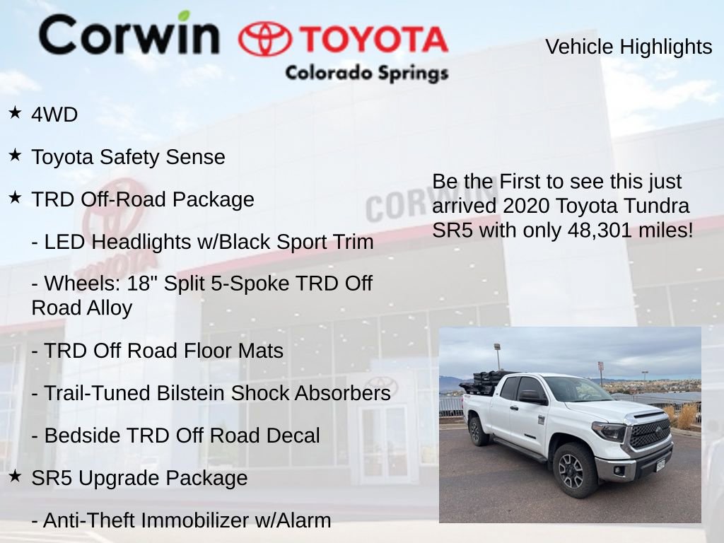 Discover the power and capability of the 2020 Toyota Tundra SR5. This rugged and well-equipped truck is ready to take on any challenge, whether you're tackling tough terrain or hauling heavy loads. With its impressive i-Force 5.7L V8 engine, 4WD, and a host of advanced features, the Tundra SR5 delivers the performance and versatility you need.