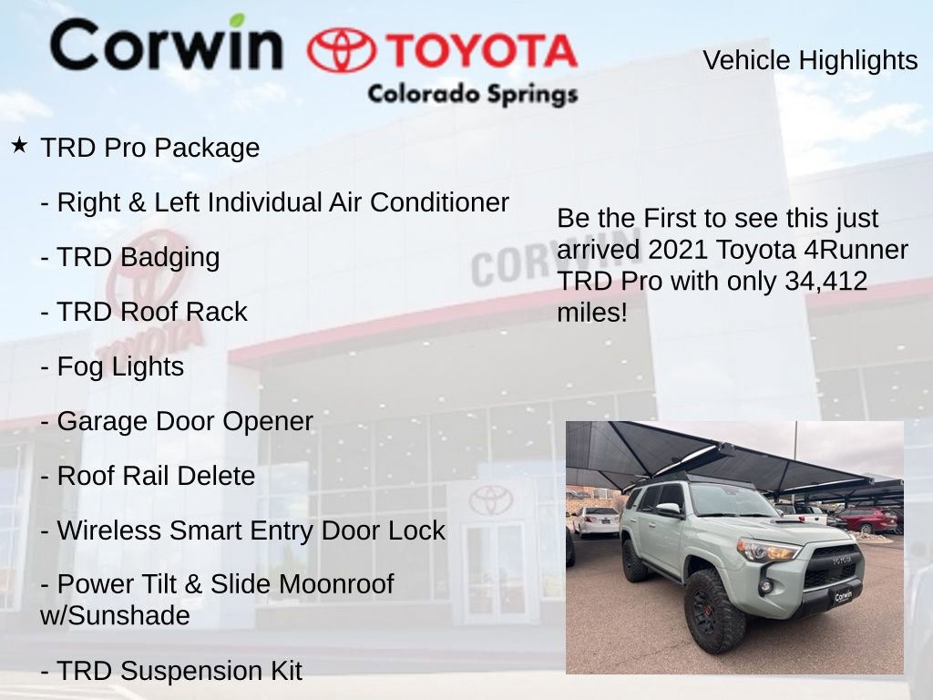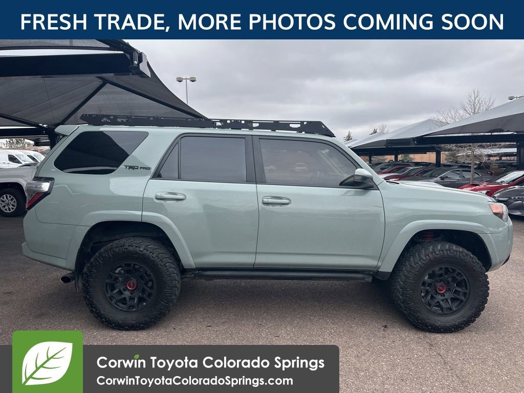 This Toyota 4Runner is well equipped and includes the following features and benefits, Fog Lights, Garage Door Opener, Power Tilt & Slide Moonroof w/Sunshade, Right & Left Individual Air Conditioner, Roof Rail Delete, TRD Badging, TRD Pro All Weather Floor Liner, TRD Pro Exhaust, TRD Pro Package, TRD Pro Shift Knob, TRD Roof Rack, TRD Suspension Kit, Wireless Smart Entry Door Lock. Odometer is 19777 miles below market average!
