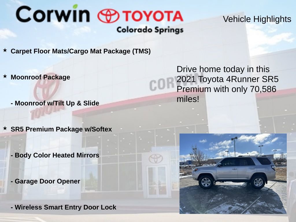 This Toyota 4Runner is well equipped and includes the following features and benefits, Body Color Heated Mirrors, Carpet Floor Mats/Cargo Mat Package (TMS), Garage Door Opener, Moonroof Package, Moonroof w/Tilt Up & Slide, SR5 Premium Package w/Softex, Wireless Smart Entry Door Lock.