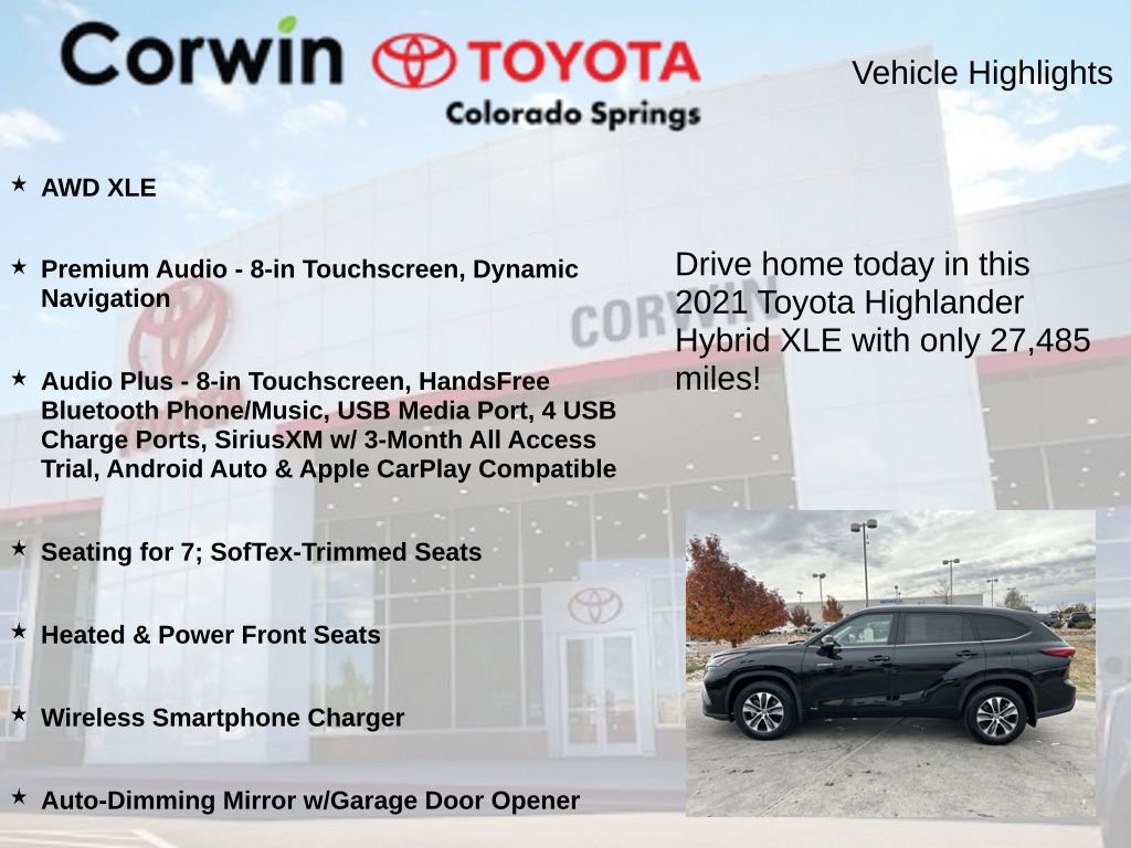 This Toyota Highlander Hybrid is well equipped and includes the following features and benefits, AWD XLE, Premium Audio - 8-in Touchscreen, Dynamic Navigation, Audio Plus - 8-in Touchscreen, HandsFree Bluetooth Phone/Music, USB Media Port, 4 USB Charge Ports, SiriusXM w/ 3-Month All Access Trial, Android Auto & Apple CarPlay Compatible, Seating for 7; SofTex-Trimmed Seats, Heated & Power Front Seats, Wireless Smartphone Charger, Auto-Dimming Mirror w/Garage Door Opener, Toyota Safety Sense 2.5+: Pre-Collision Sys w/Pedestrian Detection, Full-Speed Range Dynamic Radar Cruise Control, Lane Departure Alert w/Steering Assist, Lane Tracing Assist, Automatic High Beams, Road Sign Assist. Odometer is 11130 miles below market average! 35/35 City/Highway MPG