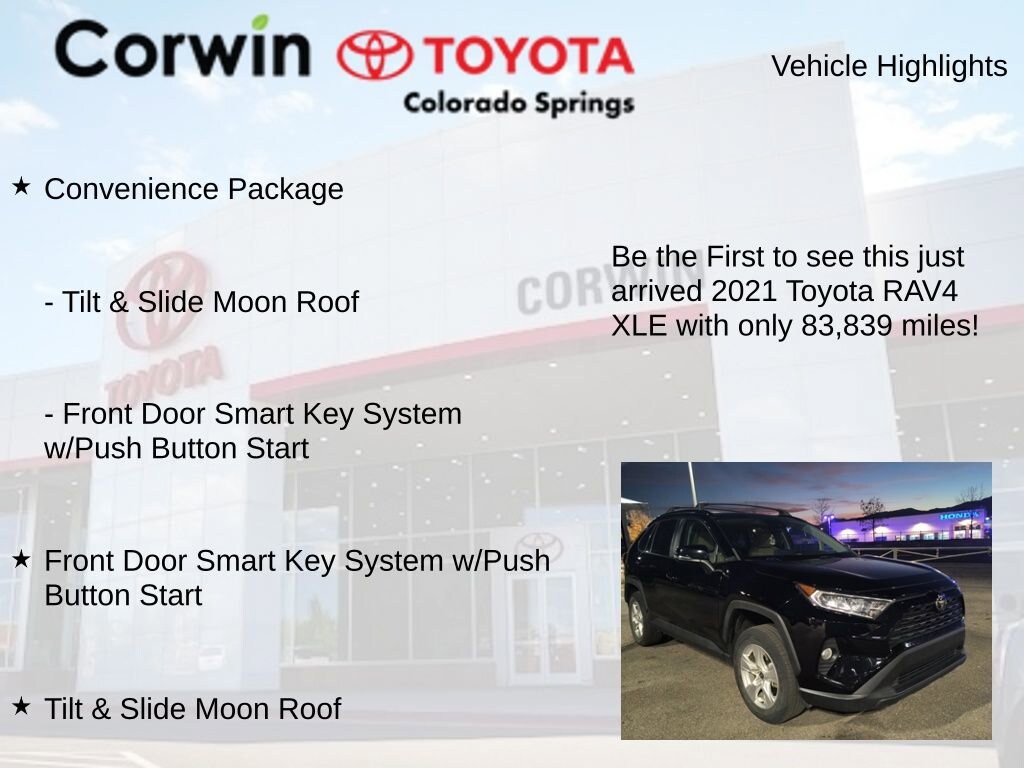 This Toyota RAV4 is well equipped and includes the following features and benefits, Convenience Package, Front Door Smart Key System w/Push Button Start, Tilt & Slide Moon Roof. 28/35 City/Highway MPG
