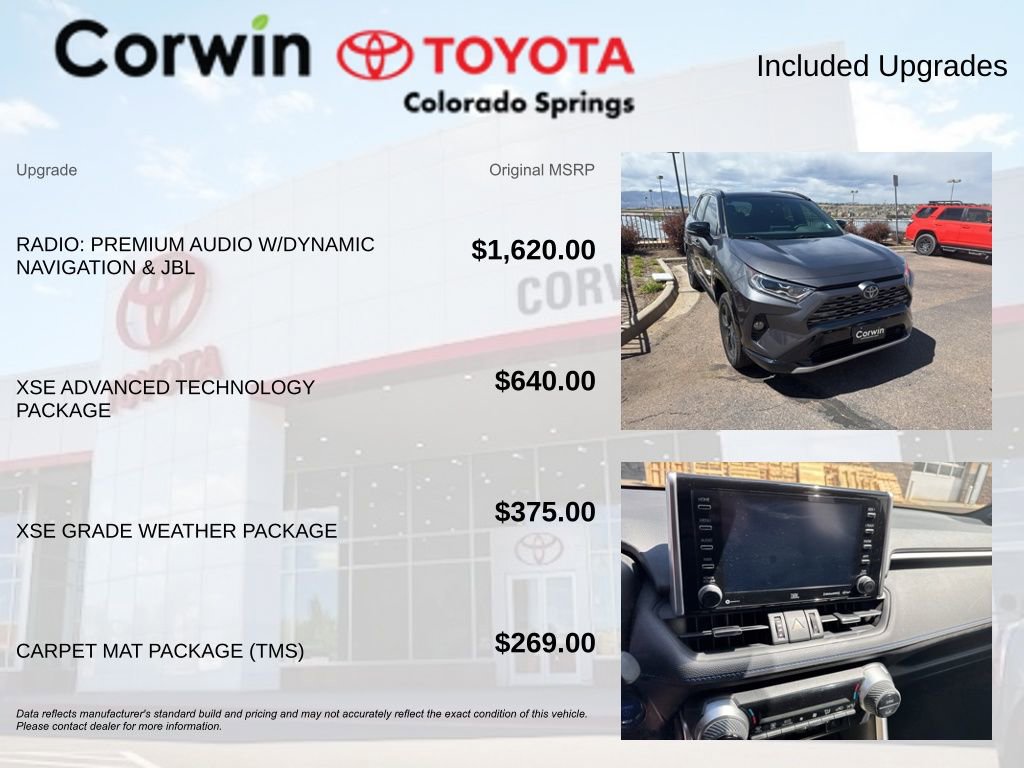 Beyond its impressive performance, this RAV4 Hybrid XSE is packed with a wealth of premium features that elevate the driving experience. The XSE Advanced Technology Package includes advanced safety and convenience features like Blind Spot Monitoring, Rear Cross-Traffic Braking, and Qi-Compatible Wireless Charging. The XSE Grade Weather Package adds heated steering wheel, rain-sensing wipers, and a wiper deicer for added comfort and convenience.