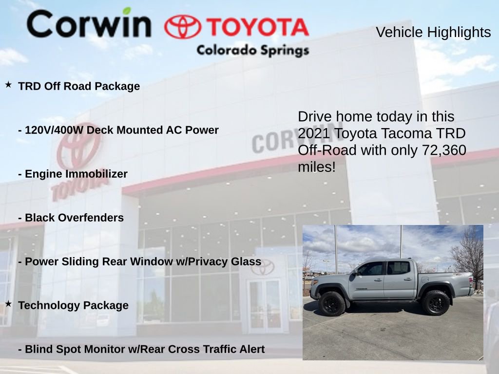 Whether you're seeking a capable work truck or a versatile adventure companion, this 2021 Toyota Tacoma TRD Off-Road V6 is the perfect choice. Discover the perfect blend of capability, technology, and comfort that will elevate your driving experience. Visit our showroom today and let us demonstrate how this Tacoma can enhance your lifestyle.
