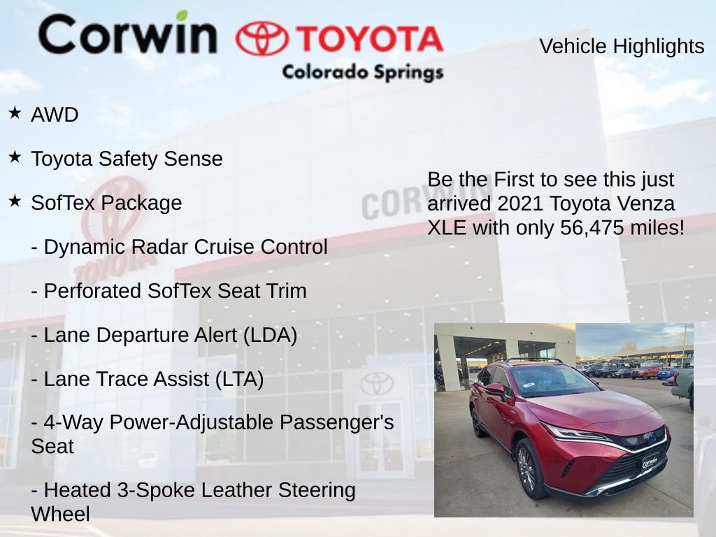 This Toyota Venza is well equipped and includes the following features and benefits, AWD, Toyota Safety Sense, 4-Way Power-Adjustable Passenger's Seat, Dynamic Radar Cruise Control, Heated 3-Spoke Leather Steering Wheel, Lane Departure Alert (LDA), Lane Trace Assist (LTA), Perforated SofTex Seat Trim, SofTex Package, Ventilated Front Seats. Odometer is 8651 miles below market average! 40/37 City/Highway MPG