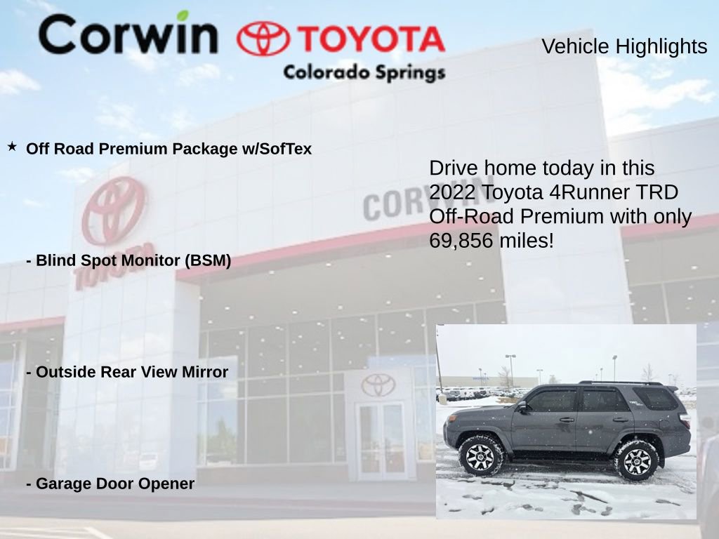 This Toyota 4Runner is well equipped and includes the following features and benefits, Blind Spot Monitor (BSM), Garage Door Opener, Off Road Premium Package w/SofTex, Outside Rear View Mirror.