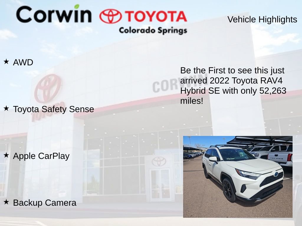 This exceptional 2022 Toyota RAV4 Hybrid SE is the perfect blend of efficiency, capability, and style. Experience the future of SUV driving today and schedule a test drive at our dealership. We're confident you'll be impressed by its exceptional performance, premium features, and unbeatable value.