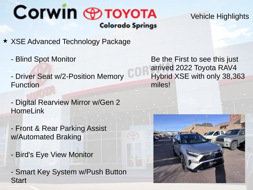 This Toyota RAV4 Hybrid is well equipped and includes the following features and benefits, Bird's Eye View Monitor, Blind Spot Monitor, Digital Rearview Mirror w/Gen 2 HomeLink, Driver Seat w/2-Position Memory Function, Front & Rear Parking Assist w/Automated Braking, Heated 3-Spoke Leather Steering Wheel, Intelligent Clearance Sonar (ICS), Qi-Compatible Wireless Smartphone Charging, Rain Sensing Front Wipers, Smart Key System w/Push Button Start, Wiper Deicer, XSE Advanced Technology Package, XSE Grade Weather Package. 41/38 City/Highway MPG