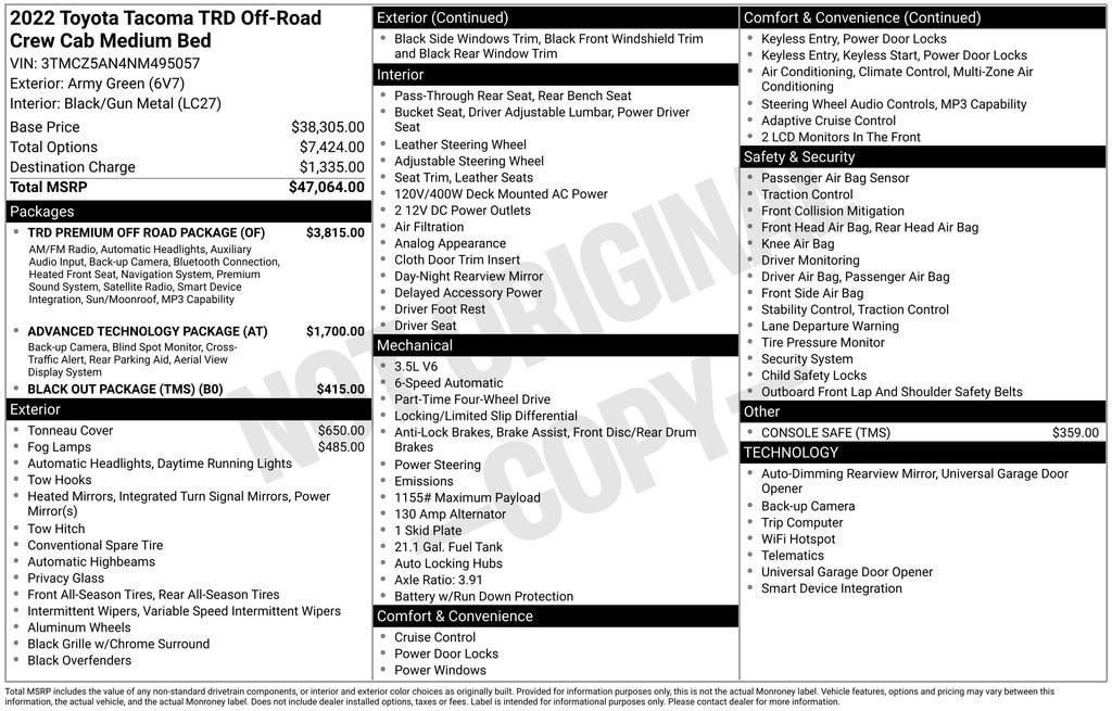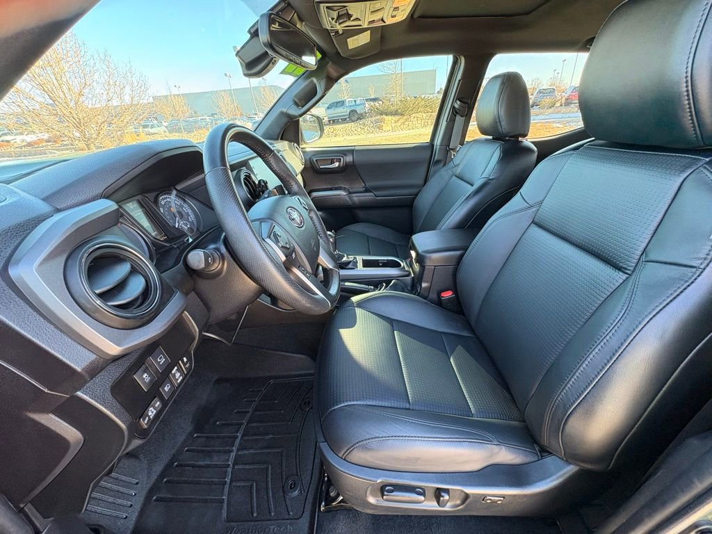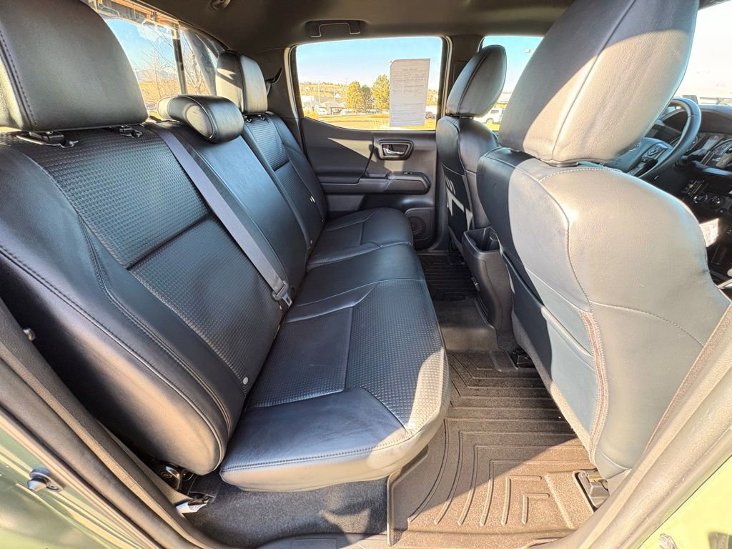 This Toyota Tacoma is well equipped and includes the following features and benefits, 120V/400W Deck Mounted AC Power, Advanced Technology Package, Auto-Dimming Rearview Mirror w/HomeLink, Automatic Headlights, Black Chrome Exhaust Tip (TMS), Black Out Package (TMS), Black Overfenders, Blackout Emblem Overlays (TMS), Blind Spot Monitor w/Rear Cross Traffic Alert, Engine Immobilizer, Heated Front Seats, Leather Seat Trim, Mesh Front Grille, Multi Terrain Monitor, Power Sliding Rear Window w/Privacy Glass, Power Tilt/Slide Moonroof, Radio: Entune Premium JBL AM/FM/CD w/Nav & App Ste, Rear Parking Assist Sonar, Smart Key w/Push Button Start, Tailgate Emblem (TMS), TRD Premium Off Road Package.