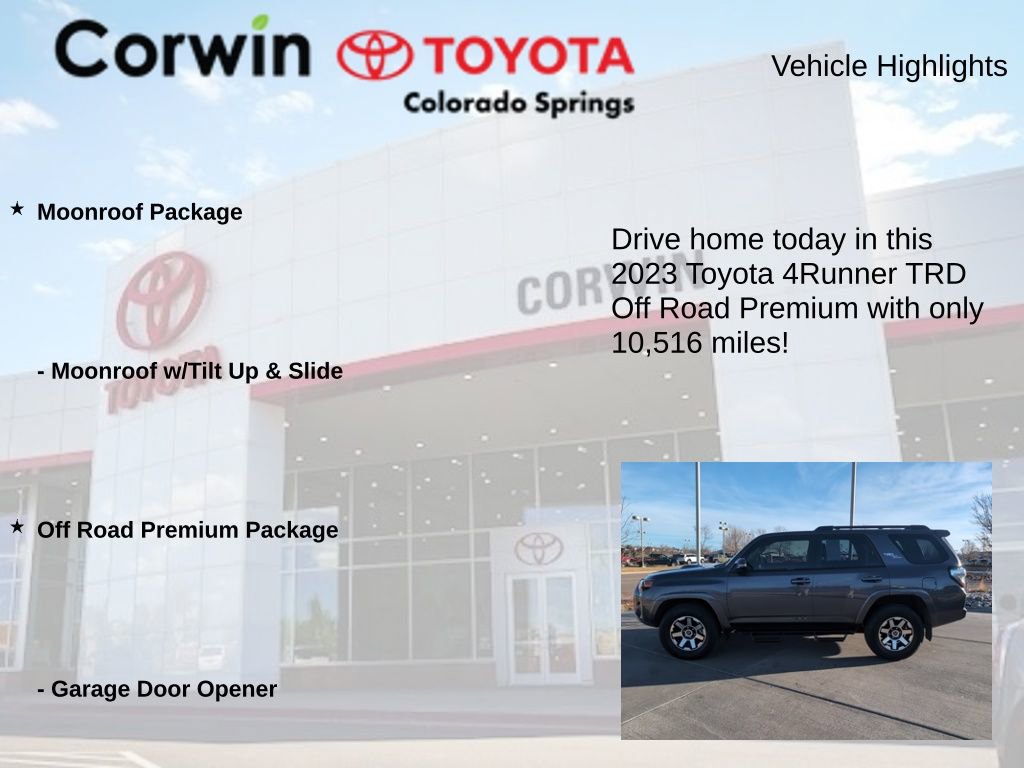 Experience the unparalleled capability and premium amenities of this 2023 Toyota 4Runner TRD Off-Road Premium. Visit our showroom today and let us demonstrate how this remarkable SUV can enhance your driving experience. We're confident you'll be impressed by its performance, features, and value. Take the first step towards your next great adventure - come see us today.