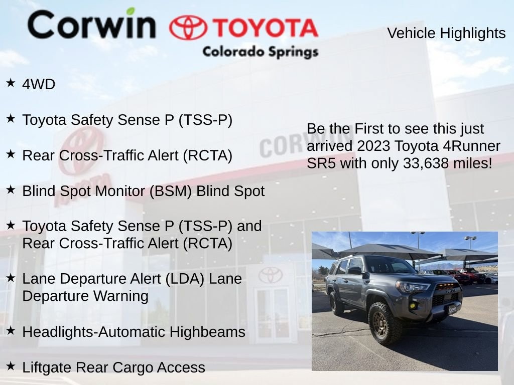 This Toyota 4Runner is well equipped and includes the following features and benefits, 4WD, Toyota Safety Sense P (TSS-P), Rear Cross-Traffic Alert (RCTA), Blind Spot Monitor (BSM) Blind Spot, Toyota Safety Sense P (TSS-P) and Rear Cross-Traffic Alert (RCTA), Lane Departure Alert (LDA) Lane Departure Warning, Headlights-Automatic Highbeams, Liftgate Rear Cargo Access. Odometer is 3397 miles below market average!