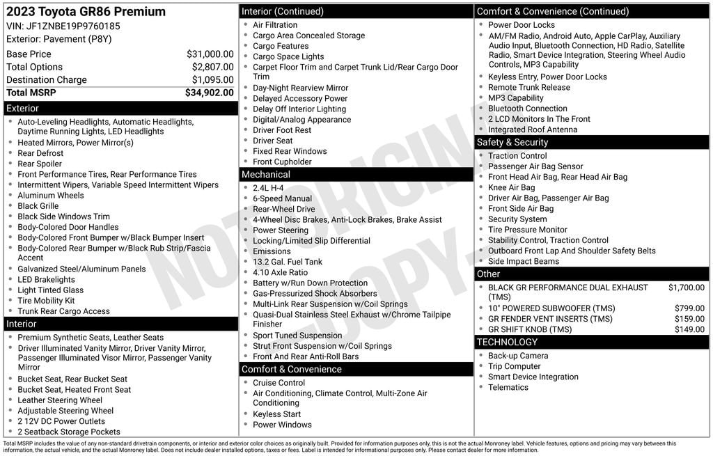 But the GR86 Premium isn't just about raw power - it's also packed with premium features that elevate your driving experience. Enjoy the comfort of heated sport bucket seats, the convenience of Apple CarPlay and Android Auto, and the peace of mind of advanced safety technologies like electronic stability control and a rearview camera.