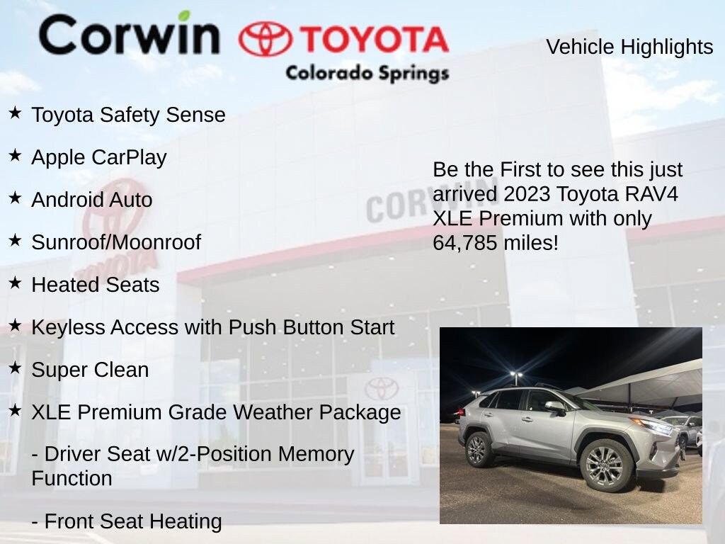 This Toyota RAV4 is well equipped and includes the following features and benefits, Toyota Safety Sense, Apple CarPlay, Android Auto, Sunroof/Moonroof, Heated Seats, Keyless Access with Push Button Start, Super Clean, 3 Spoke Leather Heated Steering Wheel, Driver Seat w/2-Position Memory Function, Front Door Smart Key System w/Push Button Start, Front Seat Heating, Tilt & Slide Moon Roof, XLE Premium Grade Weather Package, XLE Premium Package. 27/34 City/Highway MPG
