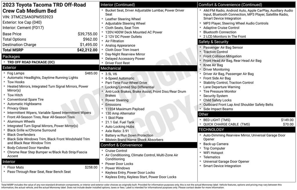 Safety is of the utmost importance, and the 2023 Tacoma TRD Off-Road V6 delivers with features like ABS brakes, engine immobilizer, low tire pressure warning, and electronic stability control. The front dual-zone air conditioning, 120V/400W deck-mounted AC power, and remote keyless entry provide added convenience and comfort.